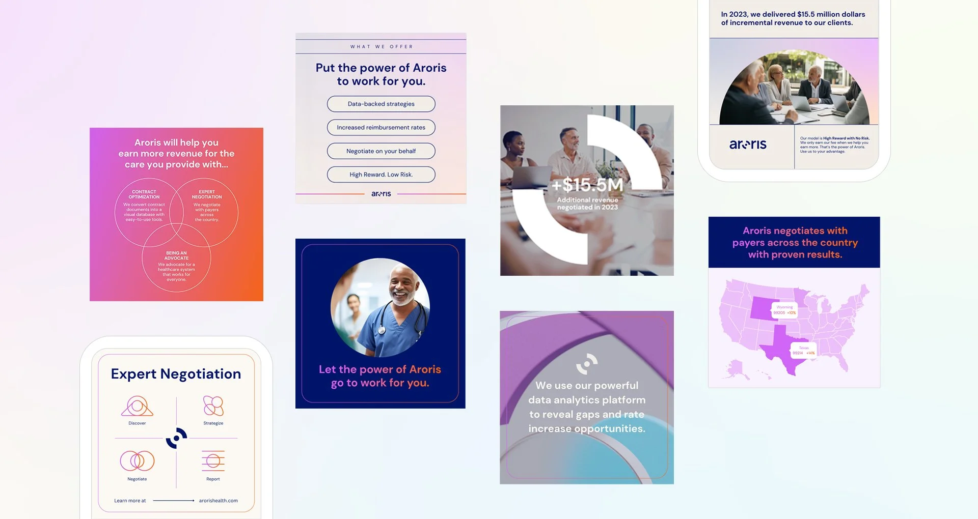 Aroris is an innovative healthcare startup based in Minneapolis, and I’ve had the privilege of partnering closely with the Aroris team and my Latitude creative crew to help shape their brand from the ground up. From early strategy through launch, I served as both designer and art director, leading the creation of their visual identity, website, landing pages, email campaigns, social content, storyboards for animation, and a comprehensive brand standards system. Our collaboration brought clarity, confidence, and cohesion to how Aroris communicates with healthcare professionals, while also supporting the growth and branding of their flagship software, Aroris360.